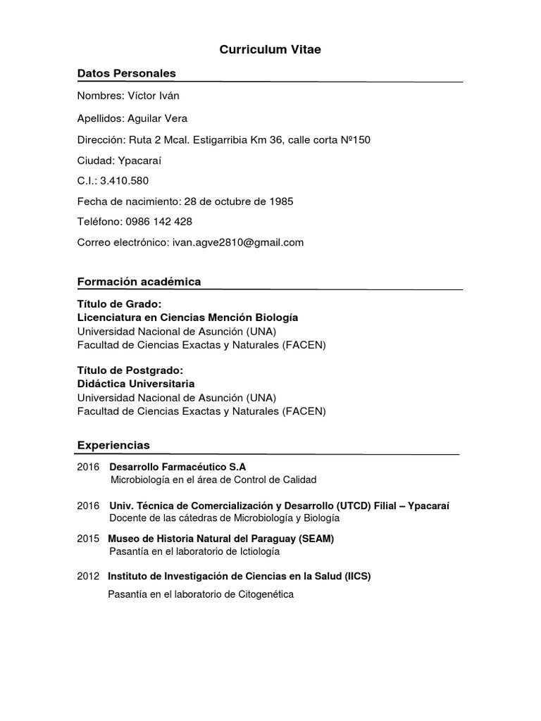 Preparan material, ponen a punto y llevan a cabo experimentos, toman mediciones e informan sobre los resultados, entre otras funciones. Empecemos por explicar que un curriculum vitae se trata de una especie de documento oficial que vendrá siendo tu carta de presentación ante cualquier empresa u organización donde estés optando por un cargo o empleo. Modelos de curriculo gratis, a consultar libremente. Ejemplo de curriculum vitae vigente en la reoública del paraguay. Para poder descargar este modelo de cv usted splamente debe presionar sobre el botón verde que dice descargar cv una vez que usted haya terminado de completar o llenar el modelo de curriculo en word ofrecido en esta web, puede curriculum vitae ejemplo plantillas de cv curriculo europeo.